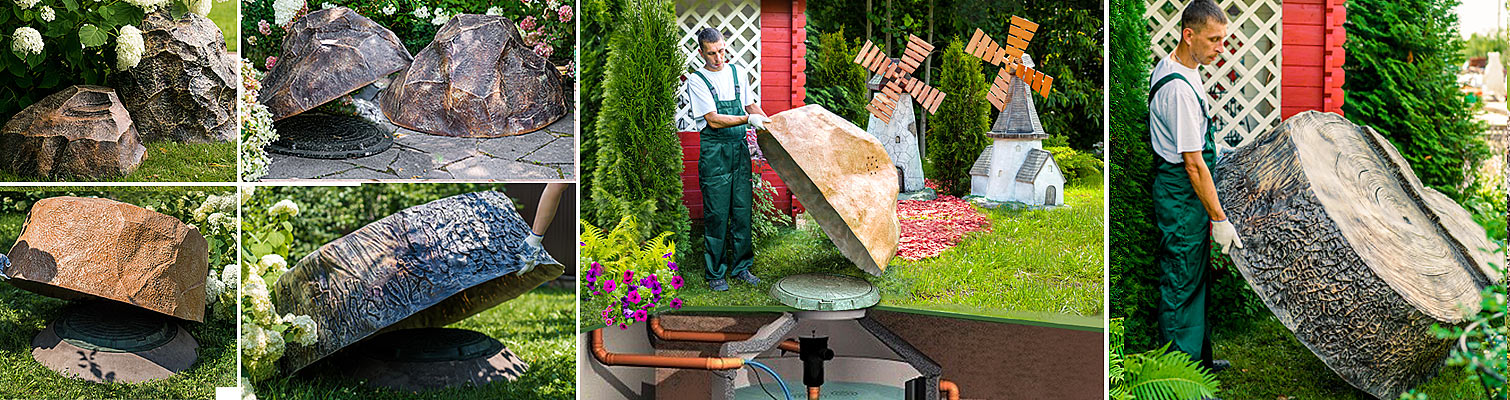 Крышки для люков и септиков — декоративные камни, пни и грибы