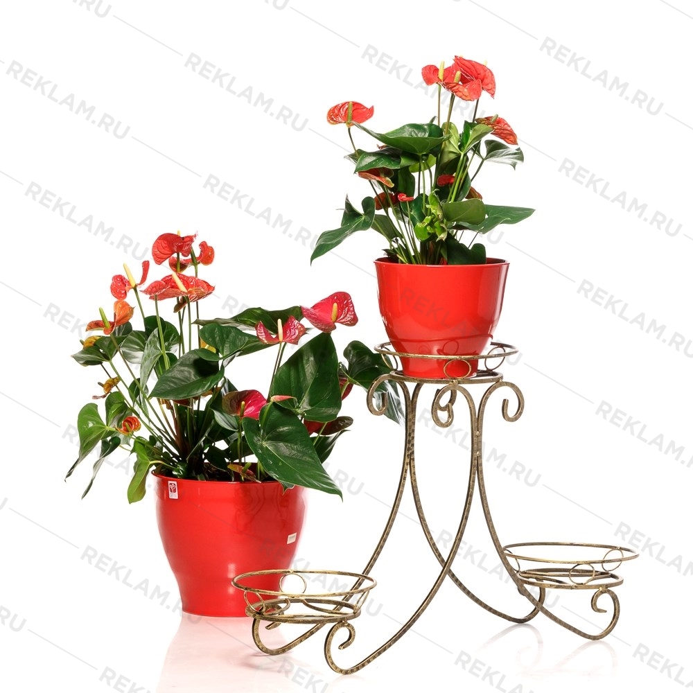 Подставка для цветов предназначена для трех цветочных кашпо, два из которых размещаются на нижнем уровне, а третий - на верхнем. Выполнена из резного позолоченного прутка. Эта кованая подставка украшена кольцами и изящными завитками, которые, переплетаясь между собой, образуют причудливый узор. Симметричность подставки не только обеспечивает высокую надежность установки цветков, но и придаёт ей строгий и презентабельный внешний вид.