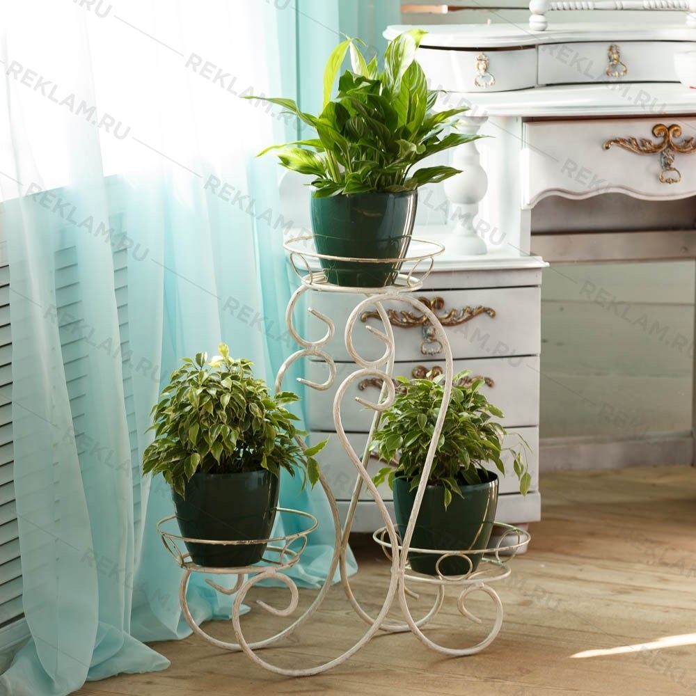 Напольная подставка под цветы предназначена для размещения трех цветков, два из которых располагаются на одном уровне, а третий – чуть выше, что позволяет создавать удивительные цветочные композиции. Изготовлена из массивного рифленого прутка. Цвет: белое золото или черный. Эта подставка изящно декорирована кольцами и завитками, которые, переплетаясь друг с другом, образуют неповторимые узоры. Легкая и практичная конструкция подставки обеспечивает высокую надежность установки цветков.