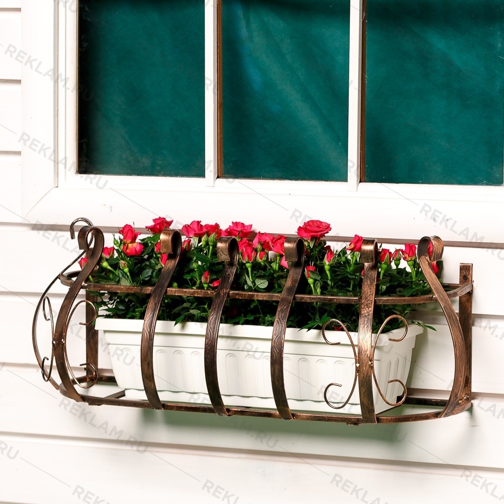 Подставка за окно для цветов изготовлена из металлаи украена изящными коваными деталями. Крепится с помощью шурупов к вертикальной поверхности. Размер ширины креплений - 10 см.
