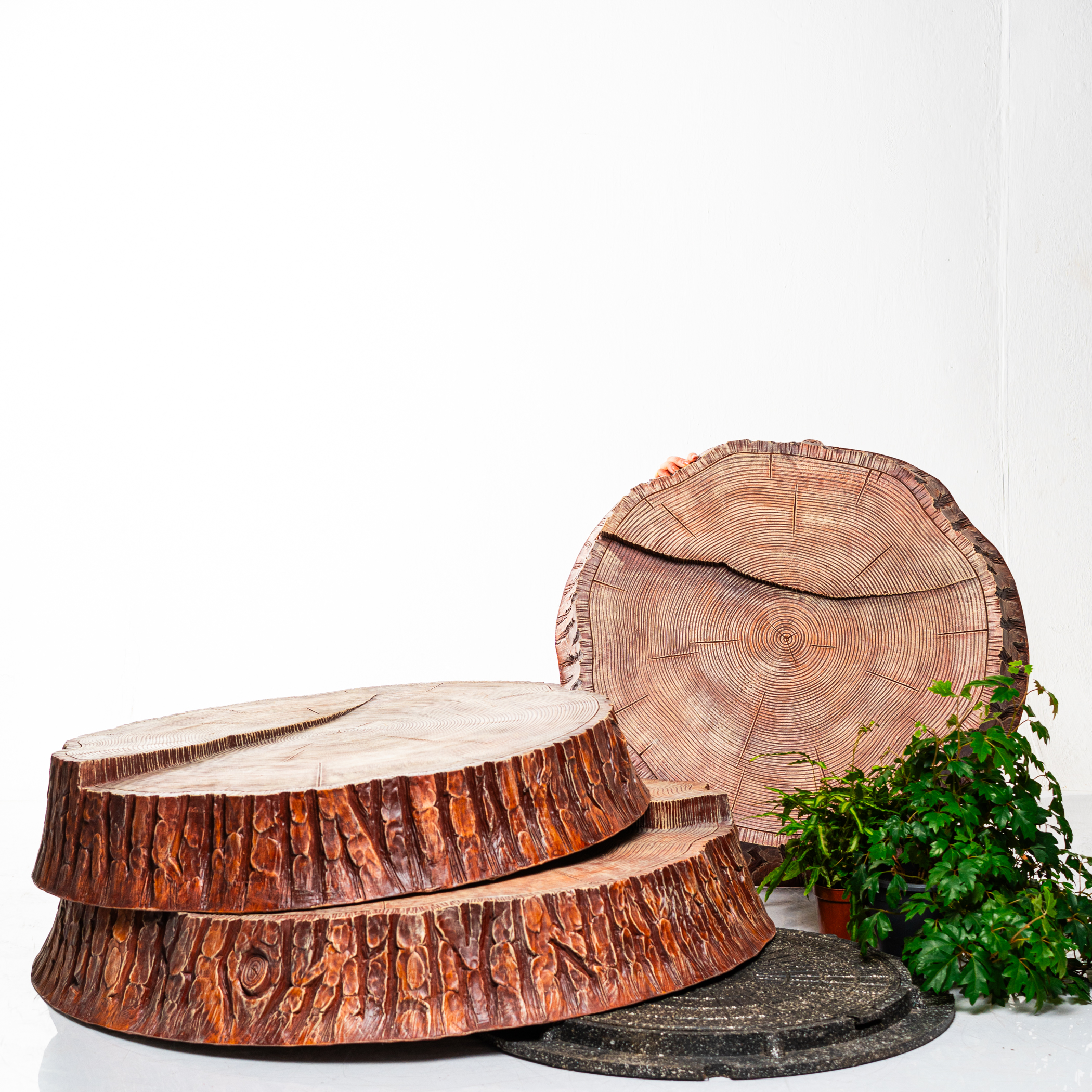 Большой диаметр 100 см подходит для широких люков септика и колодцев; детализированная текстура с годичными кольцами, корой и трещинами делает пень реалистичным. Лёгкость по сравнению с натуральным деревом упрощает установку и доступ к коммуникациям.