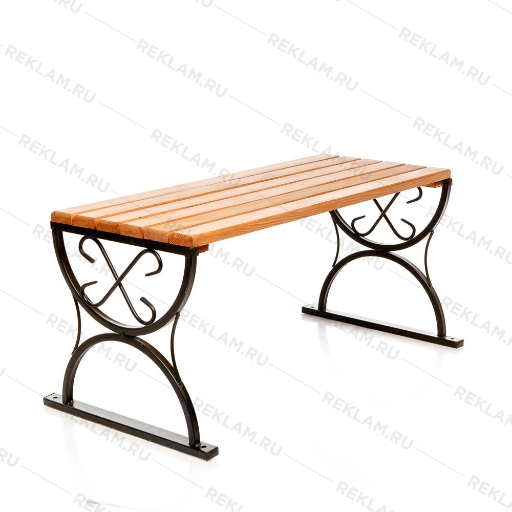 Лавочка из металла с изящными коваными ножками и деревянным сиденьем. Удобная и простая конструкция. Цвет дерева - сосна, цвет металла - черный.