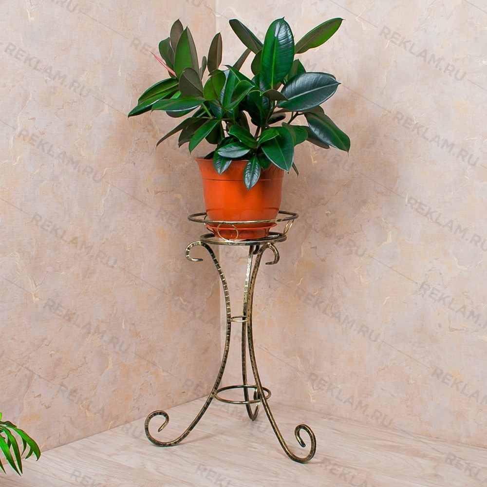 Подставка для одного цветочного горшка изготовлена из металлического прутка цвета - черный с золотом. Плавные изгибы этой подставки придают ей неповторимую форму, а продуманная конструкция отличается надежностью и устойчивостью.