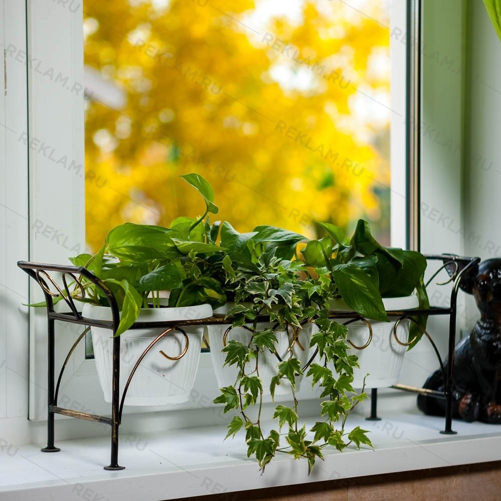 Кованая цветочница на подоконник. Надежная и прочная конструкция, выполненная из металла. Подставка позволит компактно разместить растения на окне. Рассчитана на три горшечных растения.