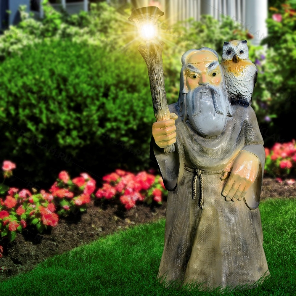Садовый светильник старик с филином. Оригинальный фонарь на вашем садовом участке будет создавать антураж и освещать зеленую территорию в темное время суток.