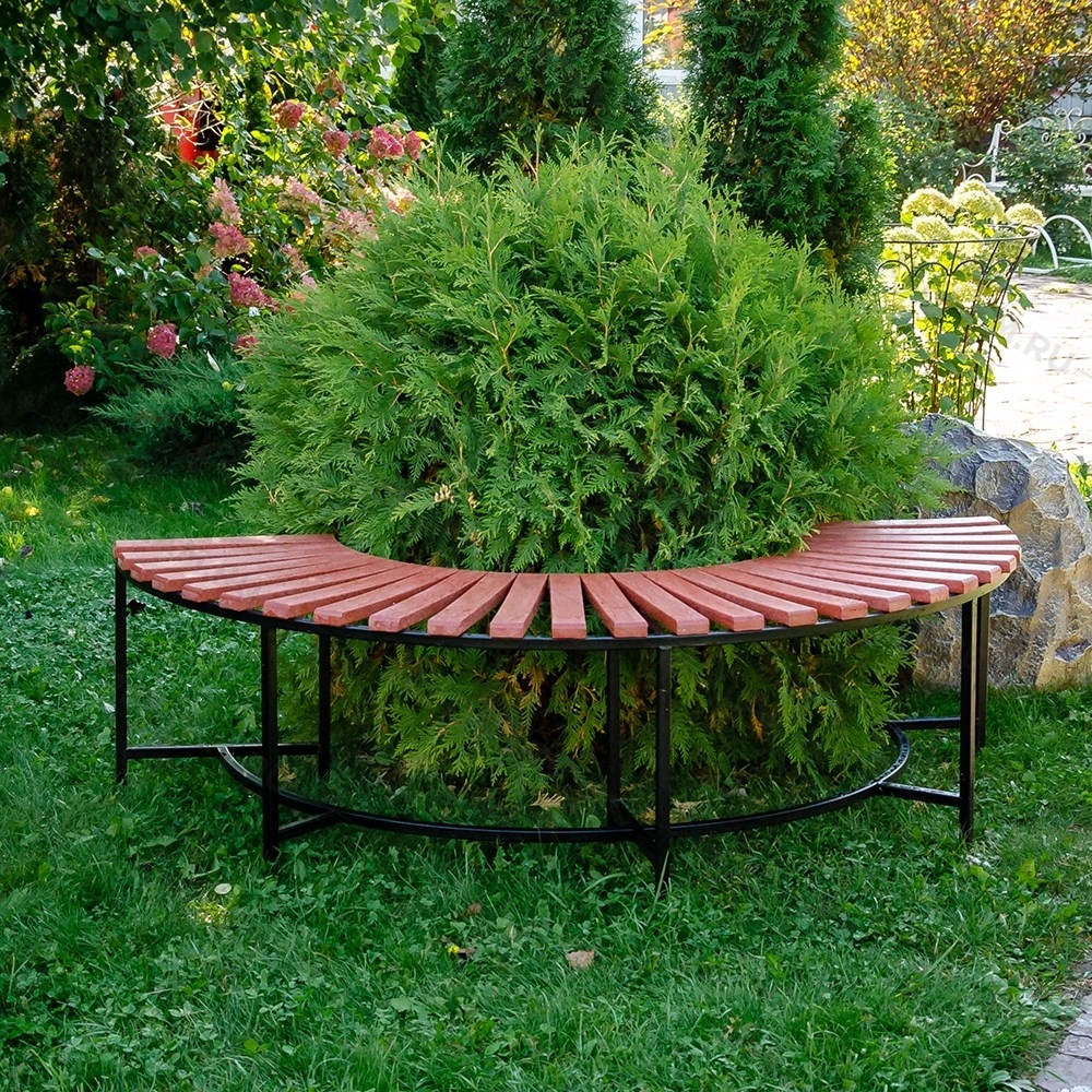 Арт. 891-056. Каркас изготовлен из металла, сиденье из полимерного бруса, ширина которого составляет 36 см. Материал неприхотлив и пригоден для уличного применения. Скамейка имеет полукруглую форму. Это удобно при размещении вокруг кустарников или деревьев.