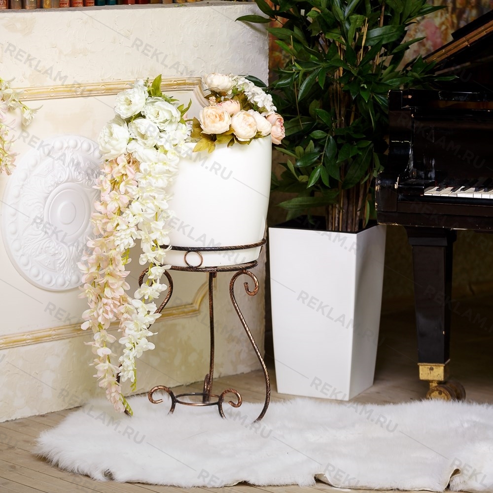 Стойка для цветов выполнена из крученого металлического прутка с изящными коваными деталями, прочная и устойчивая. Без сомнения украсит интерьер Вашего дома.