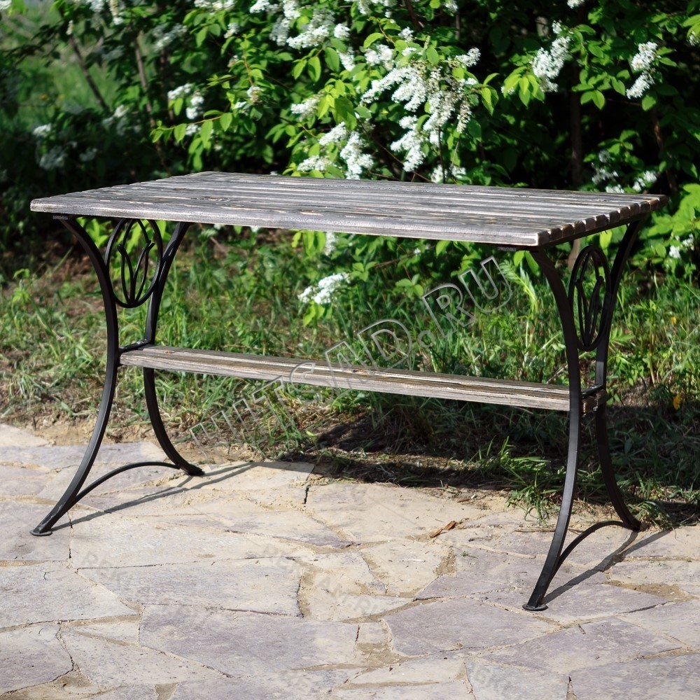 Стол для сада с изящными коваными деталями. Материал изготовления металл и дерево. Прекрасно подходит для отдыха на даче или в саду. Разборное.
