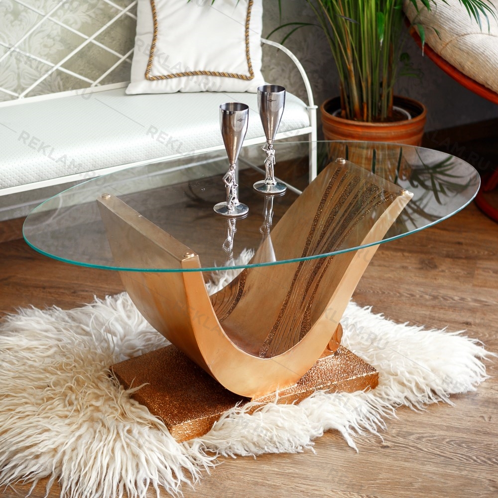 Изящный журнальный столик "Волна" для стильного оформления интерьера. Основание изделия изготовлено в форме волны из прочного материала – стеклопластика и окрашено в медный цвет. Столешница изготовлена из прочного стекла, которое в сочетании с "медным" основанием придает столику ещё более изящный вид. Использование такого элемента интерьера несомненно добавит изюминку Вашей гостинной.
